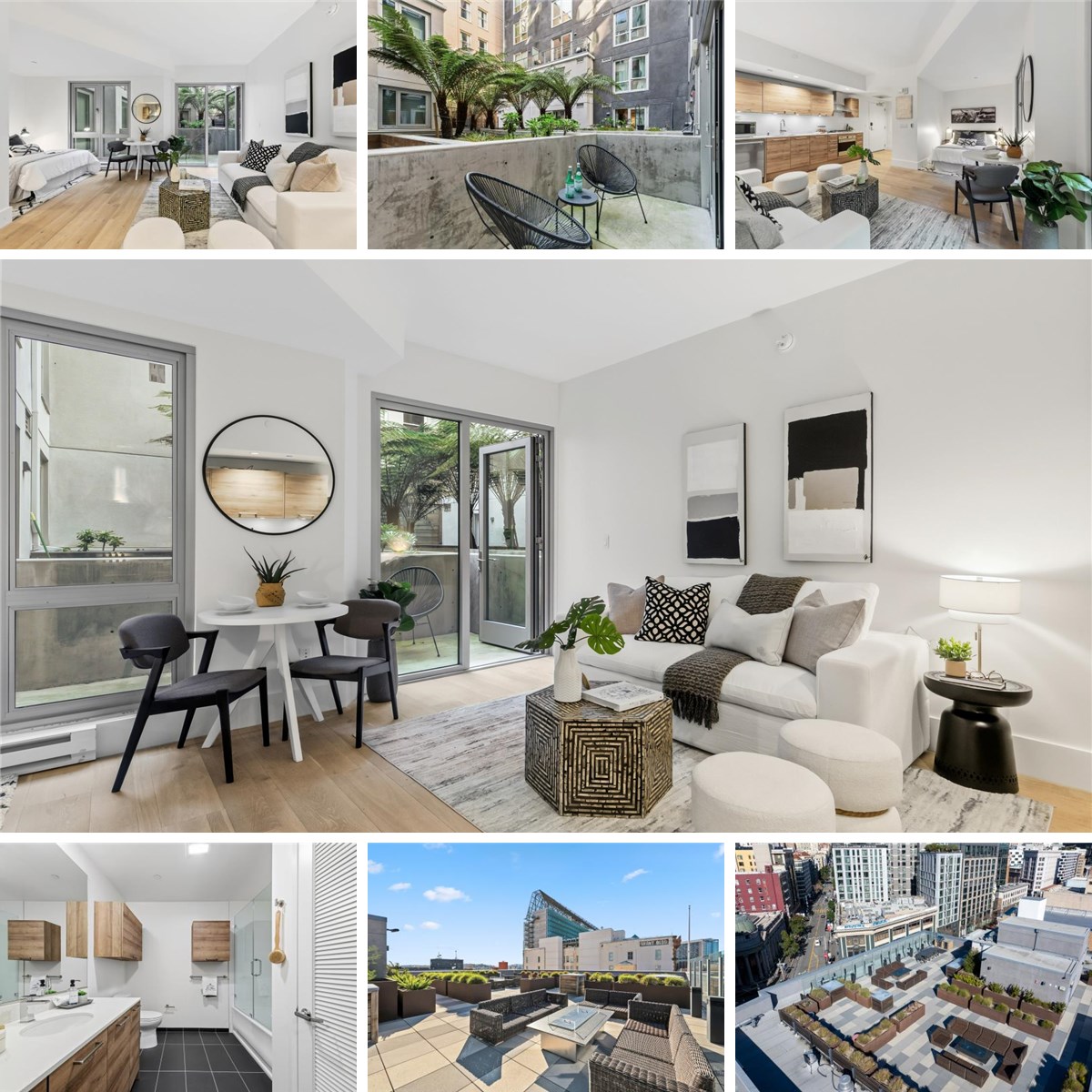 This is your moment! Welcome to urban luxury living in San Francisco’s Theater District on iconic Market Street. Built in 2018, this thoughtfully designed floor plan shares only one common wall with a neighboring unit. Elegant wood-style floors add warmth and sophistication, while abundant natural light fills the open living space. A privacy wall separates the sleeping area from the main living space, which opens to its own private patio adjoining a tranquil fern garden oasis. The bright, cheerful kitchen features sleek European appliances, perfect for experimenting with your favorite Pinterest-inspired recipes. The spacious bathroom includes an in-unit washer and dryer closet for added convenience. With deeded parking, an on-site concierge, a virtual doorman, and a Luxor package room, you’ll experience the perfect blend of exclusivity and a welcoming community atmosphere. The rooftop is enhanced with inviting amenities, including a dog run, fire pits, and a barbecue area, providing ample opportunities to relax, socialize, and host gatherings on warm summer nights while enjoying panoramic city views. Its prime location puts you just minutes from the vibrant neighborhoods of Hayes Valley, Mission Bay, and Union Square, perfect for a day of shopping and dining.